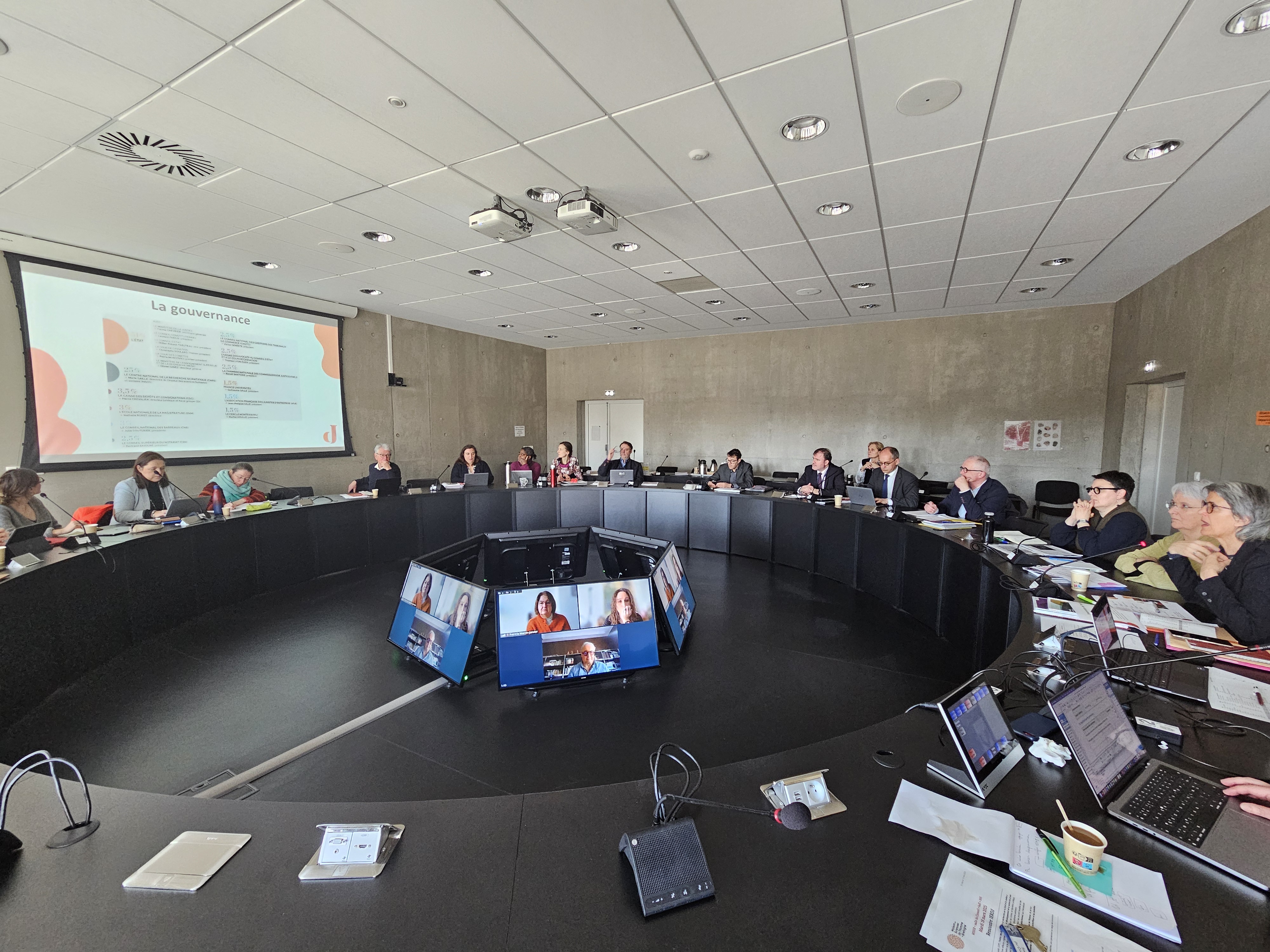 Aux côtés de Valérie Sagant, directrice de l’IERDJ, étaient présentes Isabelle Sayn, directrice adjointe scientifique, Victoria Vanneau, coordinatrice du pôle scientifique et Stéphanie Millan, responsable d’études et de recherches. Ensemble, elles ont exposé les missions, le fonctionnement et la programmation scientifique de l’Institut qui favorisent une recherche pluridisciplinaire sur les normes, les régulations et les pratiques judiciaires contemporaines.
