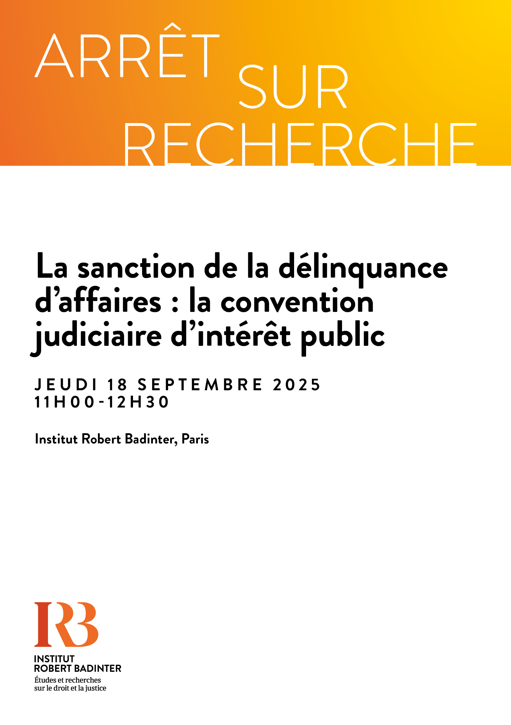 L’Institut Robert Badinter organise le jeudi 18 septembre 2025 la vingt et unième édition d’Arrêt sur recherche, événement récurrent, destiné à faire se rencontrer chercheurs et professionnels du droit et de la justice. Tiré du rapport de recherche « La transaction pénale pour les entreprises. Genèse, circulation et usage d’un dispositif judiciaire« , cette nouvelle séance proposera un débat entre Thomas ANGELETTI, sociologue, chargé de recherche au CNRS, et membre du laboratoire IRISSO à l’Université Paris Dauphine (PSL) ; Pascale CORNUT ST-PIERRE, professeure agrégée et vice-doyenne à la recherche à la Section de droit civil de la Faculté de droit de l’Université d’Ottawa et François-Xavier DULIN, magistrat, premier vice procureur financier (PNF).